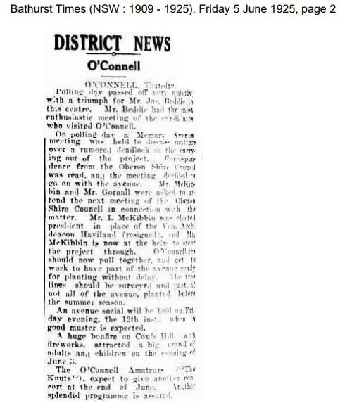 “…when the memorial is an accomplished fact, O’Connell will have as tangible evidence of its gratitude and appreciation of the services rendered to the empire by men who fought and fell, an avenue of trees …that will be a thing of beauty and a joy to all beholders. It will add to the attractiveness of the township and, besides being a memorial to the soldiers, will represent a tribute to the energetic efforts of the local Progress Association and the admirable community spirit which brought it about”.