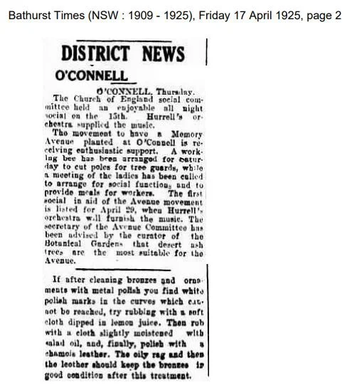 The head gardener at Machattie Park said a Desert Ash would be suitable. The trees were grown at the Bathurst Experimental Farm for the Sydney Botanical Gardens and then supplied to the O’Connell Progress Association for planting. Alan was offered the job of administering the planting of the trees, and accepted, as long as Mr Gornall was appointed too.